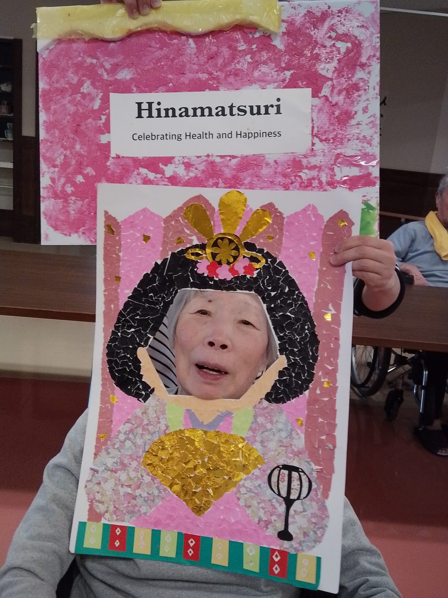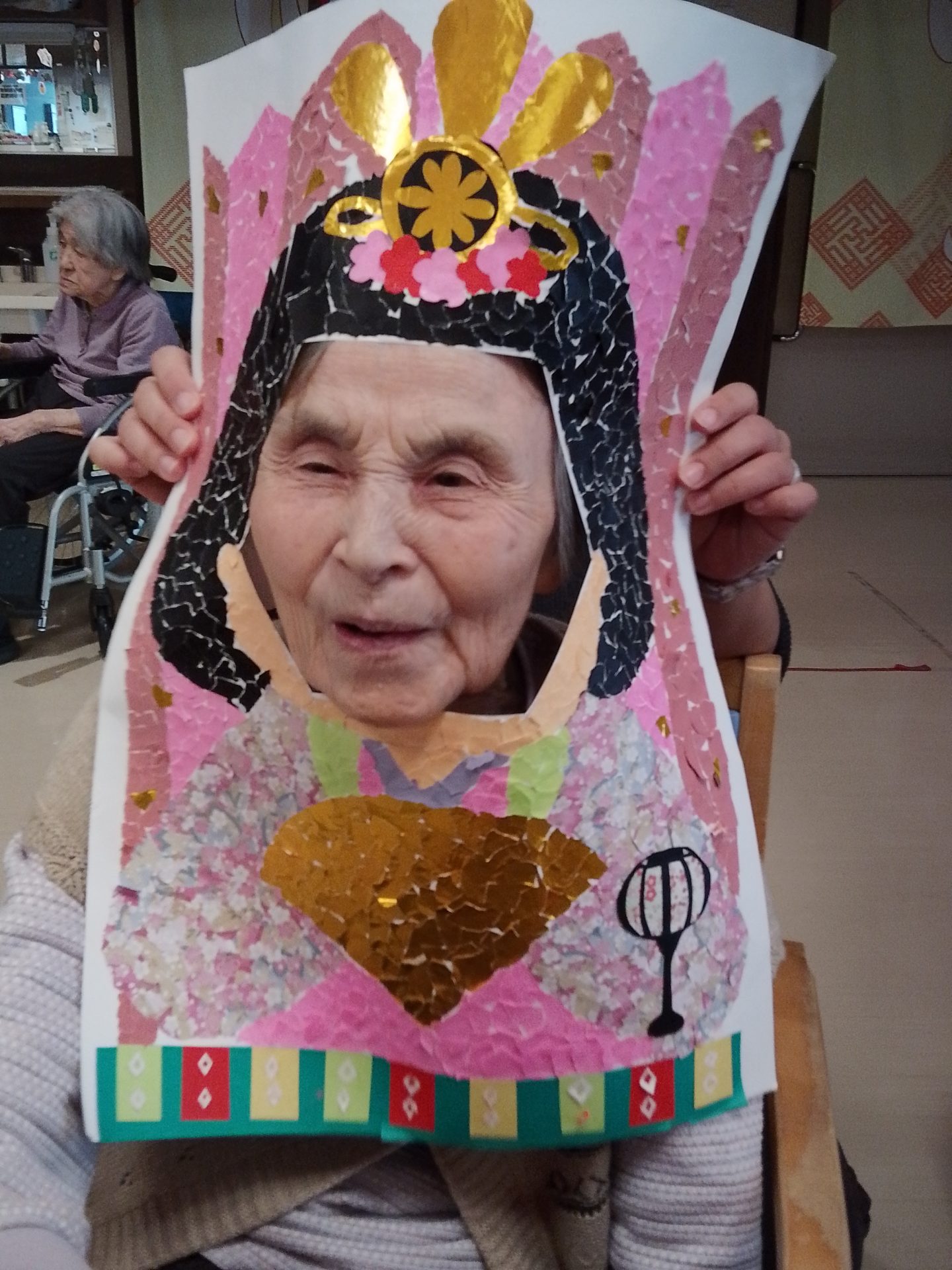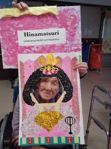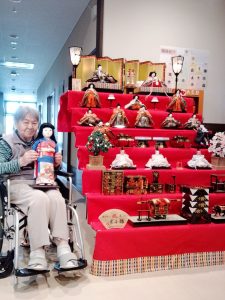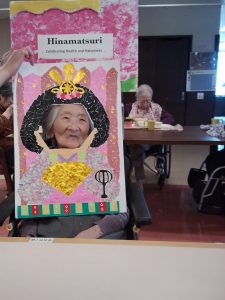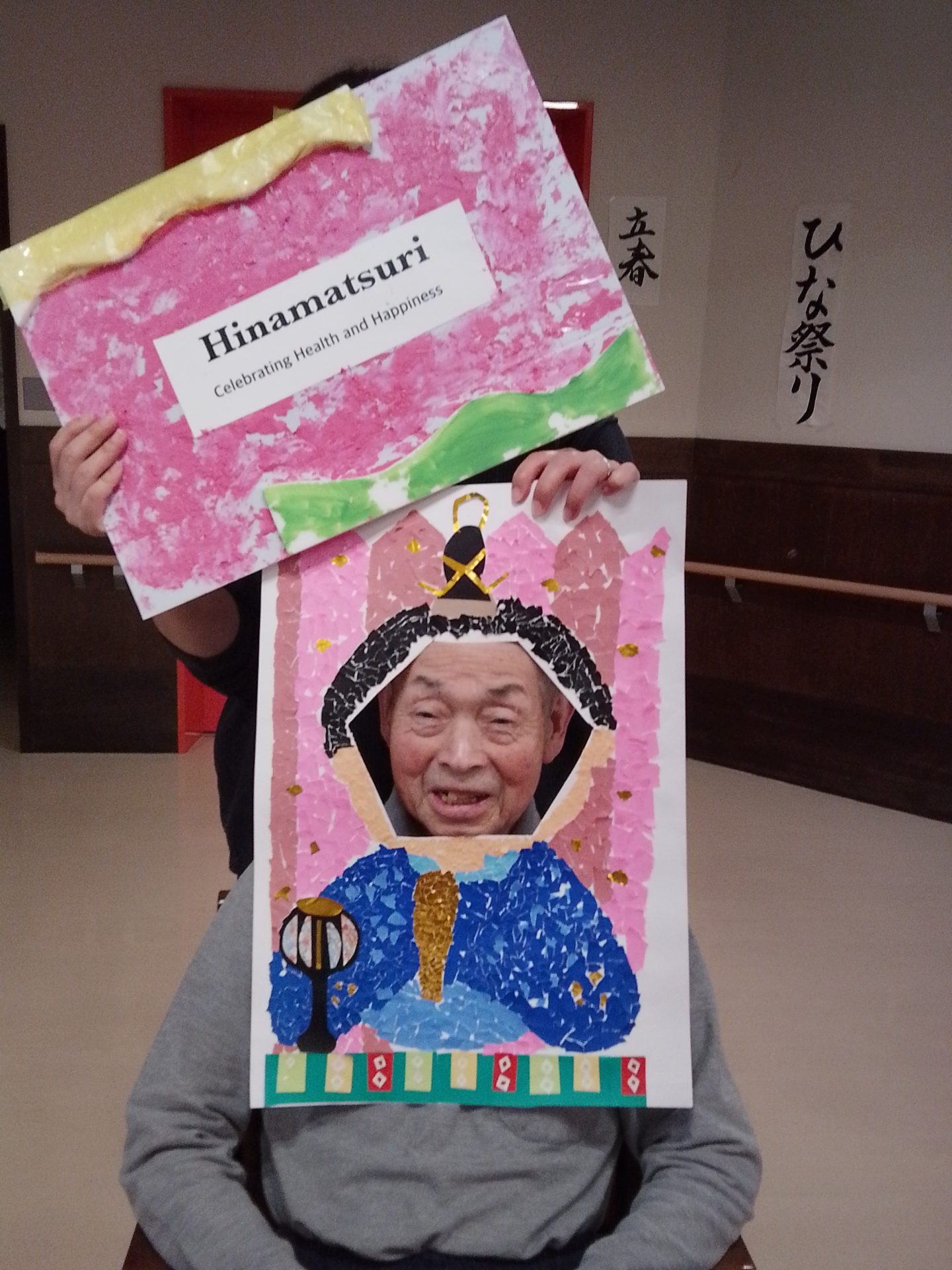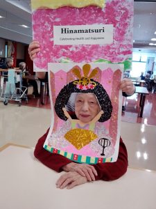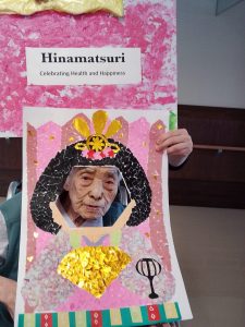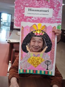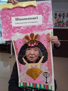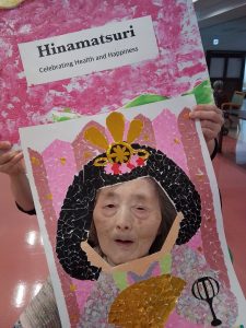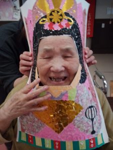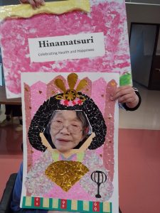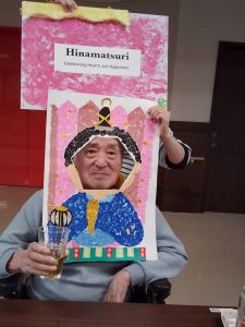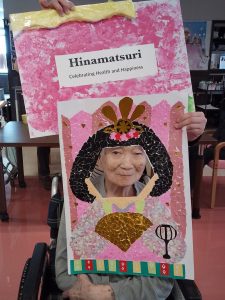 今年のひな祭りは、お内裏様とお雛様の顔出しパネルを作成し、撮影会を行いました。お内裏様とお雛様になりきり、春の風物詩を感じることができ、笑顔が見られておりました。