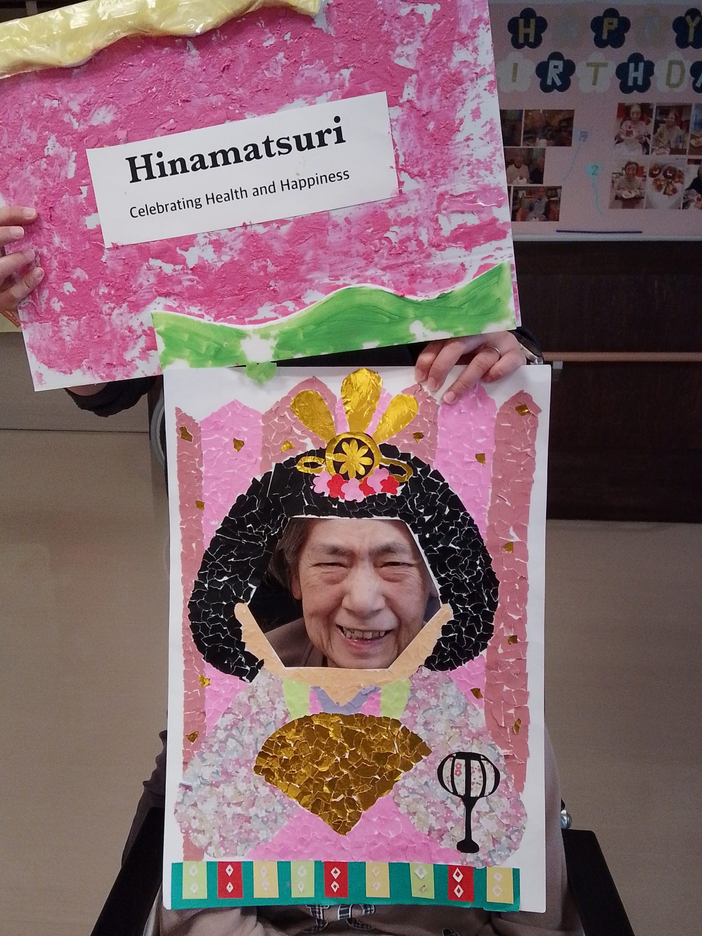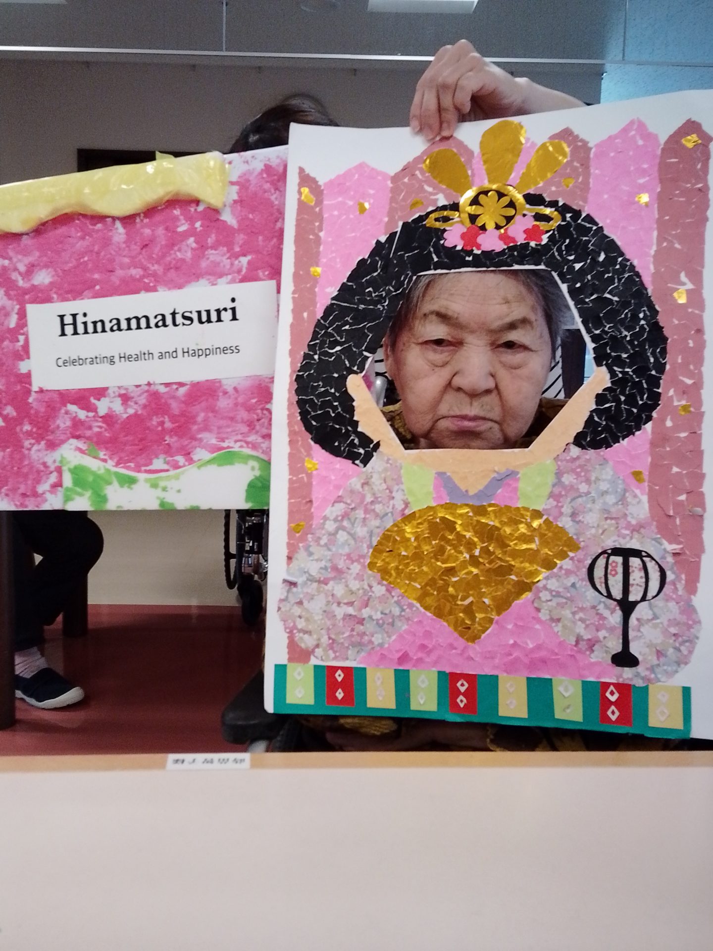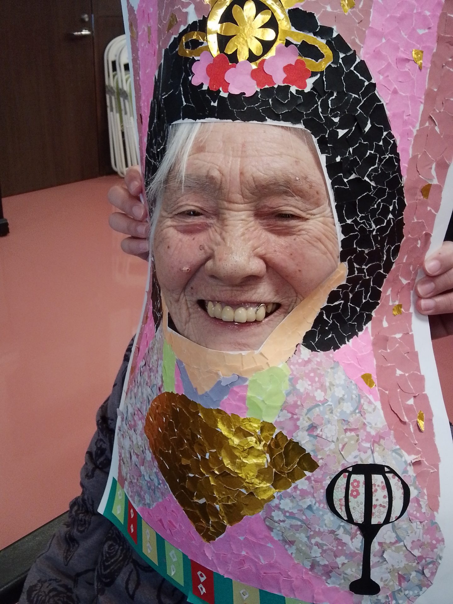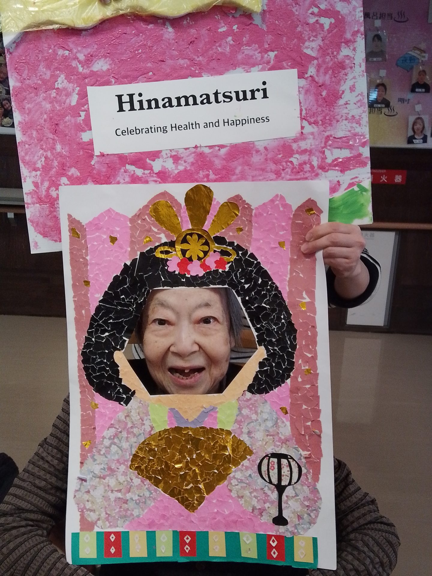 今年のひな祭りは、お内裏様とお雛様の顔出しパネルを作成し、撮影会を行いました。お内裏様とお雛様になりきり、春の風物詩を感じることができ、笑顔が見られておりました。